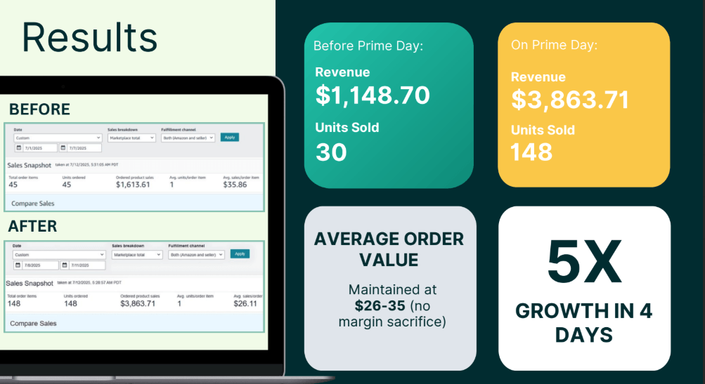 Most sellers approach Prime Day with aggressive discounting, sacrificing margins for volume. This client wanted to maximize Prime Day performance while maintaining profitability and building long-term momentum.